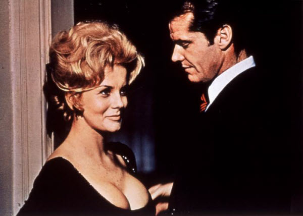 The basic “play-ness” of Carnal Knowledge is obvious upon viewing the movie (here’s a trailer). It’s an episodic story that explores the sexual mores and attitudes of two college roommates, the cynical, misogynist Jonathan (Jack Nicholson) and the eager-to-please, nice guy Sandy (Art Garfunkel), from their sexual awakening in the late 1940s to their midlife crises in the early 1970s. Along the way, we meet Susan (Candice Bergen), the college co-ed who gets involved with both men, and, later, Bobbie (Ann-Margret), the buxom starlet who seems the perfect match for the grown-up Jonathan. Like a play, the film’s scenes are mostly static with little camera motion. The film is primarily based on words; including little writerly touches like the narcissistic Jonathan’s last name being “Fuerst.” If you watch Carnal Knowledge with the sound off, you will have a hard time following the story – unlike many acclaimed films which are far more visually cinematic. As if to immediately announce the triumph of word sounds over visual pictures, Carnal Knowledge opens as credits on a black background with an extended, 3-minute, off-screen conversation between Jonathan and Sandy running underneath them.