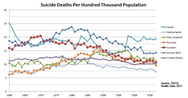 See that purple line with the Xs in the middle of the pack? That’s us, the U.S. There are two things to notice here. First, the United States, happily, is not at the upper extremes of other countries. Second, the rate has been relatively flat and stable between 1960 and 2007. The rate tends to slowly drift between 10 and 13 suicides per 100,000 people. In fact, from 1999 to 2007, the suicide rate in the US has been the lowest ever in the past 50 years.